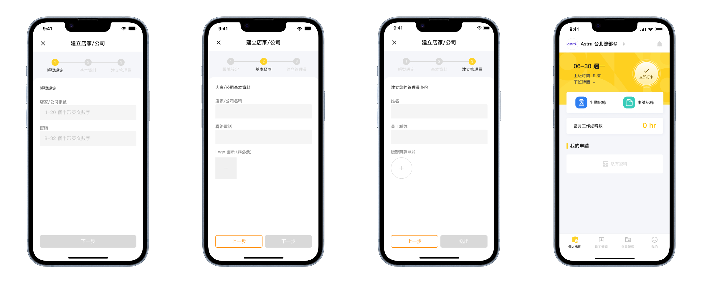 管理者至 APP Store 下載APP,透過快速登入註冊個人帳號後,再建立公司帳號