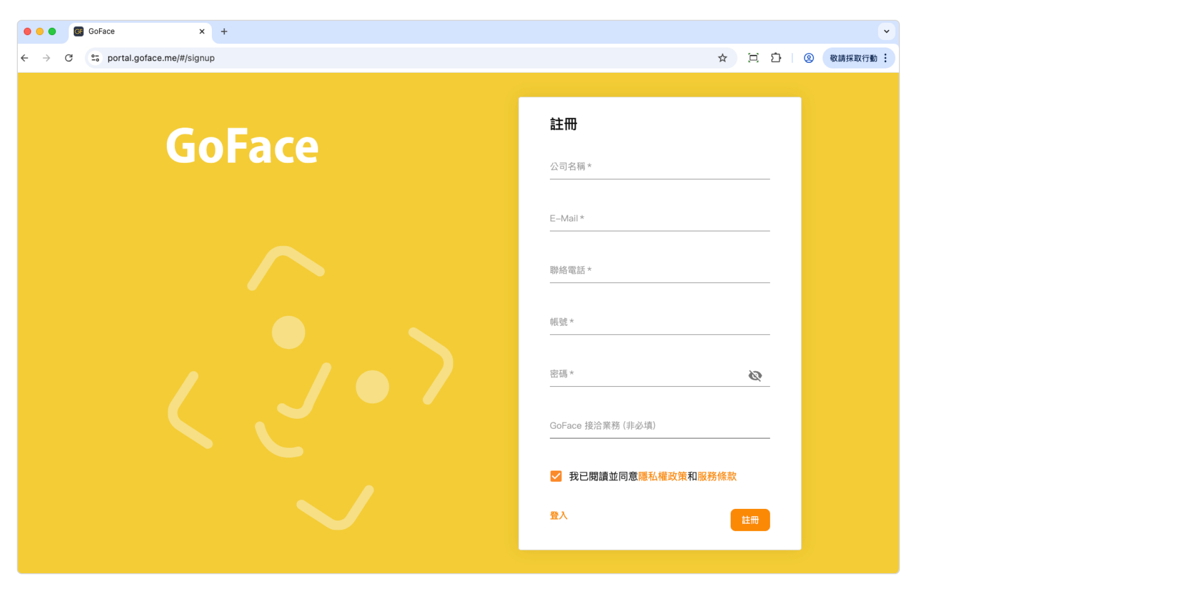 管理者至 後台網站 申請,將帳號、密碼填寫完畢後送出註冊
