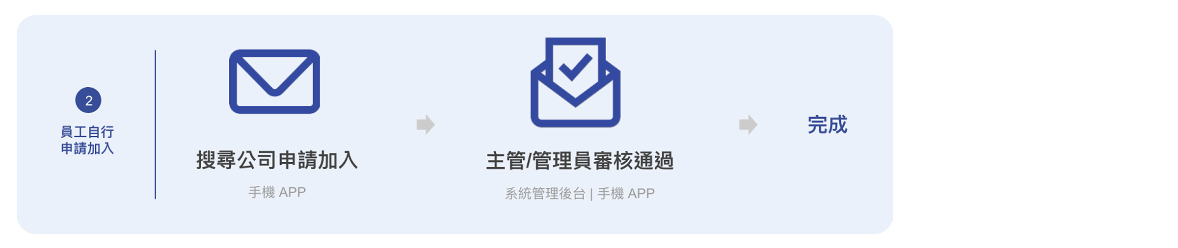 員工至 APP Store 下載APP,透過快速登入註冊個人帳號後,搜尋公司名稱申請加入,待主管審核後完成加入