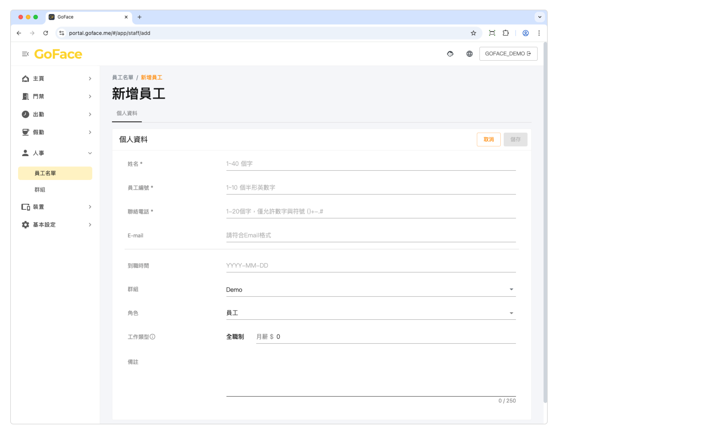 透過 [ 員工管理 > 員工資訊 ] ,點擊 + 新增員工